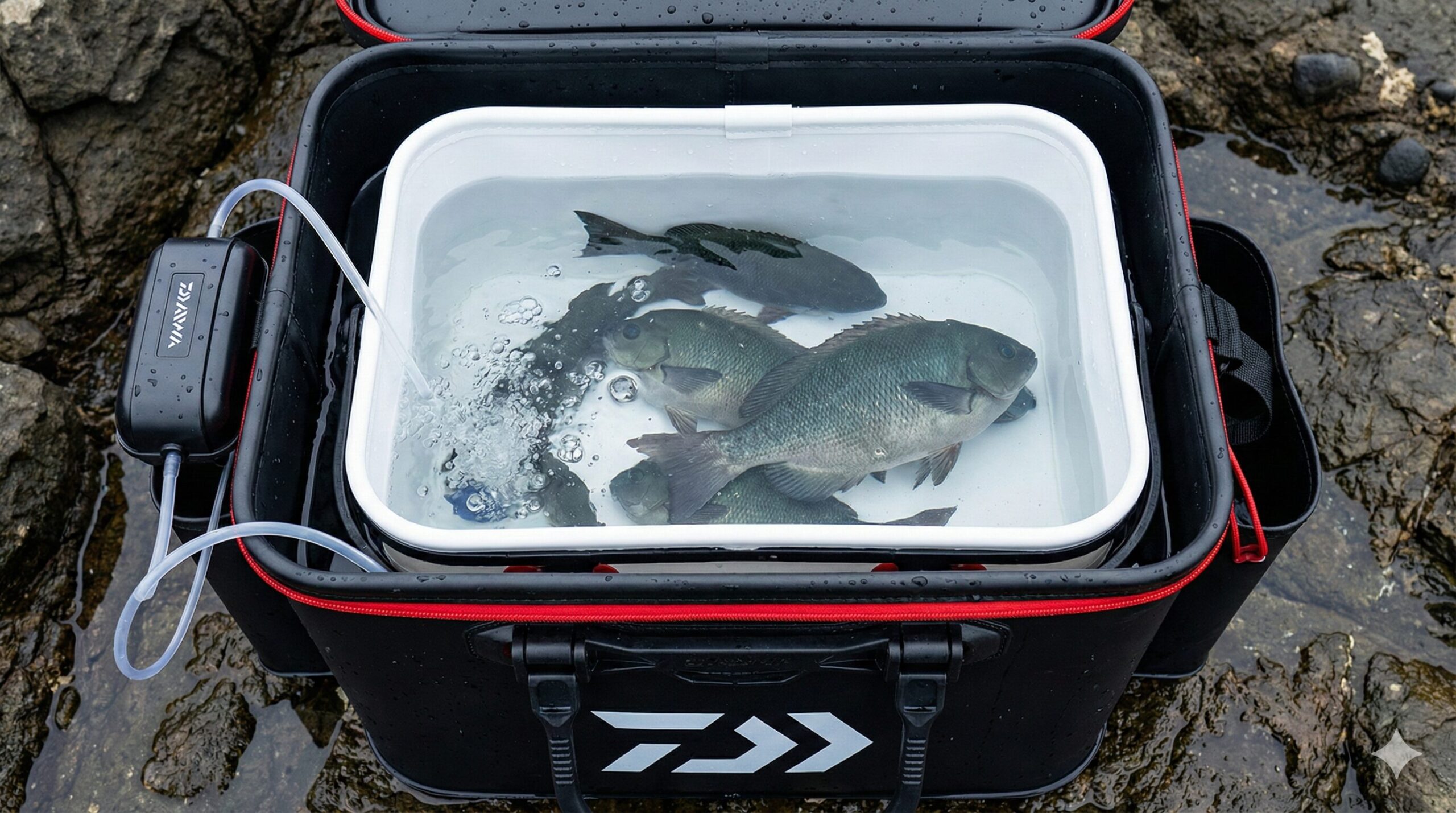 競技会に参加するトーナメンターや、釣った魚を新鮮なまま持ち帰りたい釣り人にとって、トーナメント キーパー バッカンは必須の装備です。通常のバッカンとは異なり、魚を生かしておくための工夫が随所に施されています。特に重要なのがエアポンプ(ブクブク)を収納する専用ポケットと、チューブを通すためのホール設計です。ダイワ キーパー バッカン 45やダイワ キーパー バッカン 50クラスになると、大型のグレやチヌを複数匹入れても酸素不足にならないよう、ポンプを2機セットできる仕様になっているものが主流です。